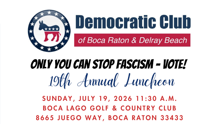 19th Annual Luncheon 2026 Luncheon TicketsTicket Option(Required) Current Member - 1 Ticket - $85 Current Member - 2 Tickets - $170 New Member - 1 Ticket - $100 New Member - 2 Tickets - $185 30 & Younger - 1 Ticket - $55 30 & Younger - 2 Tickets - $110 Would you like to be a sponsor?(Required) Yes No SponsorshipsSponsorship Packages Gold Sponsor - $1,000 Silver Sponsor - $750 Bronze Sponsor - $550 Individual Ads Full Page $500 Half Page $450 Second Cover $600 Third Cover $550 Back Cover $700 Center Page (Guaranteed) $650 Business Card $100 Luncheon NamesPlease enter the name(s) of the attendees below. Please click the plus (+) at the end of the line to add additional names.Attendee Names(Required)First NameLast Name Add RemoveI/We would like to sit with:Contact InformationName(Required) First Last Phone(Required)Email(Required) Address(Required) Street Address Address Line 2 City AlabamaAlaskaAmerican SamoaArizonaArkansasCaliforniaColoradoConnecticutDelawareDistrict of ColumbiaFloridaGeorgiaGuamHawaiiIdahoIllinoisIndianaIowaKansasKentuckyLouisianaMaineMarylandMassachusettsMichiganMinnesotaMississippiMissouriMontanaNebraskaNevadaNew HampshireNew JerseyNew MexicoNew YorkNorth CarolinaNorth DakotaNorthern Mariana IslandsOhioOklahomaOregonPennsylvaniaPuerto RicoRhode IslandSouth CarolinaSouth DakotaTennesseeTexasUtahU.S. Virgin IslandsVermontVirginiaWashingtonWest VirginiaWisconsinWyomingArmed Forces AmericasArmed Forces EuropeArmed Forces Pacific State ZIP Code Payment InformationPayment Method(Required) Credit Card Check Payment by Check Information Check Payment - make payable to: Democratic Club of Boca Raton & Delray Beach Mail to: PO Box 880206, Boca Raton, FL 33488Amount to Pay By Check $0.00 Credit Card InformationCredit Card Fee Price: $0.00 Total Credit Card(Required)Card Details Cardholder Name